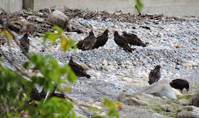 The Turkey Vulture. While this is not a very attractive bird it is actually very helpful in nature. This bird is a scavenger and cleans up dead carcasses in the wild (like deer, raccoons, etc. that have been hit by cars), and dead fish that wash up on shorelines. I learned to identify them in flight because they soar in large circles, and quite often you will see more than one of them. Right now they are getting ready to migrate so you might find them catching thermals on a windy day. They are a very large bird and when you are identifying them you might think you are seeing an eagle or osprey. The tips of their wings spread out and look like fingers. They have a featherless red head. Sometimes you might find them roosting on fence posts.|  |