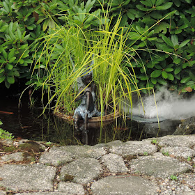 The main feature of these gardens was the large man-made pond and waterfalls with a beautiful inviting gazebo. Evergreens and  grasses offer a sense of coolness and shade. You can see the beginning of the drought in this area in the lawn. Several dry patches were noticed in some of the areas.